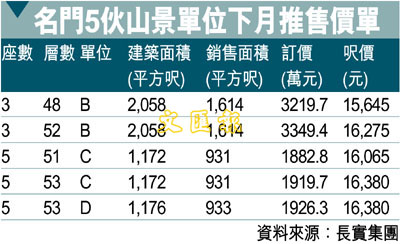 長實助理營業經理何家欣指出,計劃於8月底重推的名門第3及5座5伙山景單位,包括第3座48及52樓的B單位,面積2,058呎,及第5座51C、53C及53D,面積為1,172及1,176呎,為3房連主人套房及4房連主人套房設計,訂價介乎1882.8萬元至3349.4萬元。