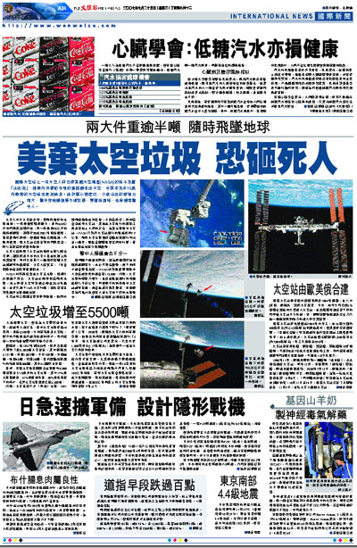 國際太空站上一名太空人前日按美國太空總署(NASA)的指示充當「垃圾佬」,將兩件共重逾半噸的舊儀器丟出太空,令原本充斥10萬件廢物的太空情況更加惡劣。由於運行速度快,小型垃圾的破壞力很大,擊中穿梭機後果不堪設想,墜落地面時,也有機會擊中人。