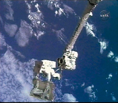 ■太空人安德森在吊臂末端,手持太空垃圾。 美聯社