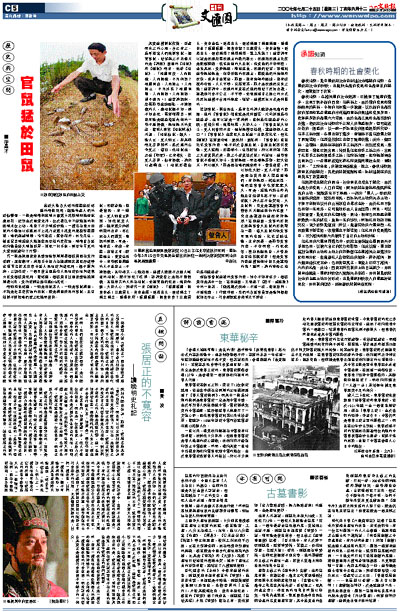 最近大陸各大報刊媒體廣泛報道的兩條新聞,頗能喚起人們的近似聯想。一條是湖南洞庭湖方圓幾十萬畝湖洲地帶鼠患成災。近期由於雨量充沛,位於長江中下游地區的洞庭湖水位上漲,淹沒了不少湖邊沙地,一種名為東方田鼠的小動物以多達成千上萬乃至幾十萬隻的規模整體遷徙,牠們翻越湖堤,啃咬樹皮,蠶食稻禾,扒吃花生,嚴重侵害湖邊廣大地區黎民百姓的農作物。湖南省各級政府動員廣大湖區群眾,採取一切手段,對百年罕見的大量田鼠進行了打擊。
