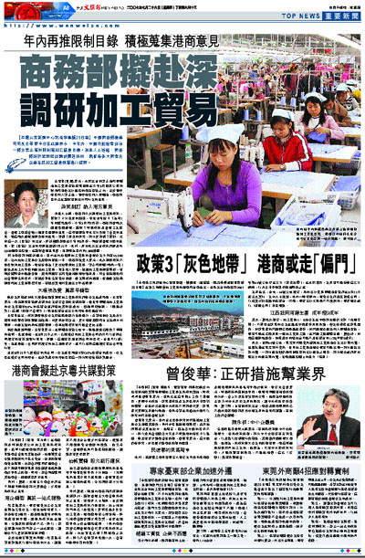 【本報北京新聞中心記者李雪穎25日電】中國商務部產業司司長王琴華今日在此間表示,今年內,中國可能還會出台一部分禁止類和限制類加工貿易目錄。消息人士透露,商務部將於近期派出調研團赴深圳,與香港各大商會及企業等就加工貿易問題進行磋商。
