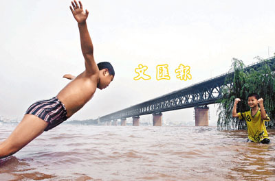 兩江夾擊武漢,令當地水位跳漲,住在附近的少年也趁此機會下江游泳,挑戰自然。法新社
