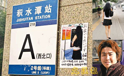 ■齋籐卓也在地鐵遇到女孩後一見鍾情,尾隨女孩下車並偷偷拍下「積水潭女孩」(右上圖)。之後齋籐把那個女孩的照片打印出來,貼在地鐵口附近還在網上發帖稱「已經找你10天了」(上圖)。齋籐卓也(右下圖)曾經報名參加過中華才藝大賽,自我介紹是一個「喜歡中國的人」。