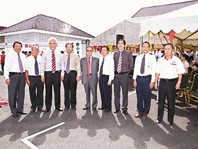 ■本報副社長潘一黎(中)及《聯合日報》副社長拿督劉賢威、董事拿督陳恩化、董事長蘇美光、社長拿督林昌和、董事經理沈永亮、《中國報》代表林明德、《聯合日報》副董事長鄭隆儀及總經理羅啟光於《聯合日報》大廈落成典禮合攝。 聯合日報