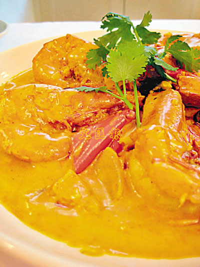 澳門的咖喱和部分的香料,是由葡萄牙人從馬來西亞的馬六甲傳入。「秘製咖喱大蝦」除了加上香濃的咖喱,還有豐富的香料。老闆黃太更表示,此咖喱汁為餐廳秘製而成,有別其他餐廳,加上來自澳洲爽甜的大蝦,是食客的鍾愛菜式之一。