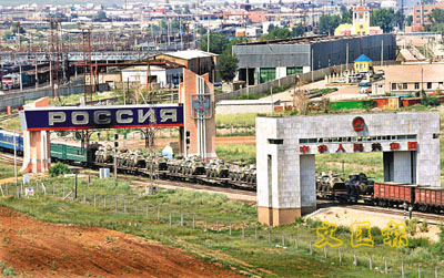 ■27日13時02分,參加「和平使命-2007」聯合反恐軍演的中方第一批鐵路運輸參演部隊換乘俄羅斯軍列,駛出滿洲里口岸進入俄羅斯境內。 新華社
