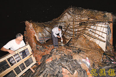26日,安徽肥東縣店埠、撮鎮、牌坊、梁園4個鄉鎮遭受11級狂風襲擊,上千座房屋毀壞、倒塌,幾千畝莊稼絕收,有3人在大風中受傷。圖為村民清理遭大風損毀的房子。 新華社