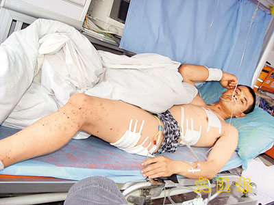 26日,在通往硯山採訪爆炸事件的路途中,在120急救車上,記者看到了被炸傷的廠長唐勇軍,他的胸、腿、臂部多處受傷,但意識較清醒,接受記者採訪之時,體內尚存留有十餘片彈片的他正在轉往昆明進一步接受治療。