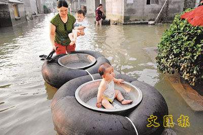 ■ 27日,被淮河洪水浸泡近30天的安徽鳳台縣大山鎮夏灣村村民帶著孩子出門。當日,安徽淮南、蚌埠等地最高氣溫已經達到38攝氏度。 新華社