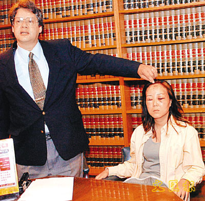 ■2004年7月21日在美國商務考察的中國天津女子趙燕在旅遊點觀光時遭美國移民局警員無端毆打,面部多處受傷。圖為律師斯坦利.里根(左)在紐約的辦公室查看其傷勢。資料圖片
