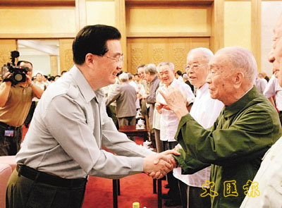 ■胡錦濤同出席座談會的老戰士親切交談。 新華社