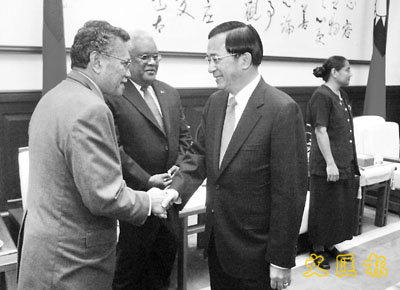 ■陳水扁(右二)27日接見「南太平洋友邦」代表團。 中央社