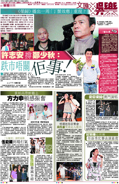 歌星許志安有投資中資股,而且都是賺錢的,他對股市下跌絕不驚慌,也唔信「丁蟹效應」,認為是健康的。「股市總不會長升不跌呀,我撐秋官,唔關佢事!『丁蟹效應』是個笑話,正如佢講跌下先才有機會入貨。」安仔強調自己投資股票不是貪賺大錢,而是為了追番通貨膨脹,否則銀紙放在家會貶值。「我買中資股是睇好中國經濟發展,以前大家都看美國的,現在全世界都睇住中國。」安仔目前忙拍戲及準備表演的工作,心情絕未受跌市影響。