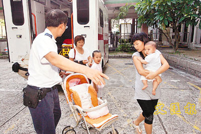 ■被地鐵列車車門夾傷的男嬰由母親抱送醫院敷治。本報記者蔣焯文攝