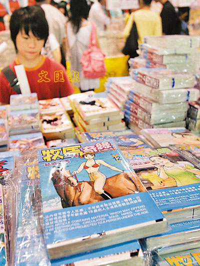 本報記者現場所見,其中一個主要售賣小說、漫畫及精品的攤位,吸引了不少青年排隊選購。攤位內出售的漫畫書,不乏一些涉及色情或暴力的漫畫,雖然這些漫畫均貼上警告字句,聲稱內容令人反感,不可售予18歲以下人士。不過,這些封面露骨的色情或暴力漫畫,卻任意擺放在場內,未成年人士隨意可見到其封面,吸引幾名小童試圖購買,最後被收銀員拒絕。