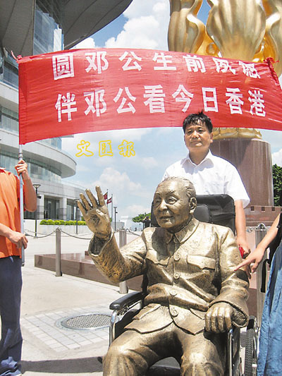 【本報訊】(記者 譚靜雯)「今次香港之行是完成兩位老人家的心願!」河南一名平凡老百姓何長水娓娓道來。已故國家領導人鄧小平生前的心願是97年見證香港回歸,這也是何長水父親何呈祥臨終時的心願。為了完成兩位老人家的夙願,何氏家族出錢出力,共花費4萬元人民幣,委託河南省工藝美術館鑄造鄧小平銅像。其中兩姊弟又自費專程由河南乘火車到深圳,再到香港。