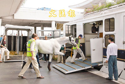 奧運馬術測試賽「好運北京香港回歸十周年盃」於下月11至13日舉行,昨日首批共8匹海外參賽馬運抵本港機場,隨行還包括馬僮、獸醫等工作人員。8匹參賽馬在機場接受漁護署檢疫後,隨即分批登上裝設空調的白色運輸專車,由警方派出多輛交警鐵馬為車隊開路,前往比賽場地之一的沙田體育學院,參賽馬匹會入住學院內新改建的冷氣馬廄,需要隔離10天,另外兩批參賽馬匹將於下周抵港。
