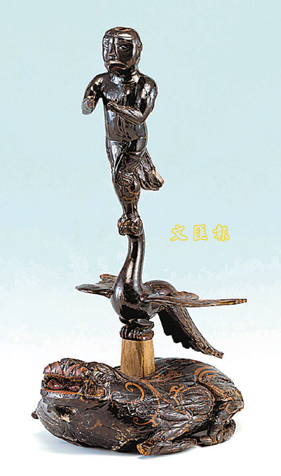 「漆羽人」恐怕不是人,是神。中國的「羽人」,可不像西方的天使般長著雪白的翅膀,出場總是十分「浪漫」。中國的羽人,是古時巫文化中的「明星」,往往同時具有人與鳥的特徵,造型十分怪異奇特。就說這「漆羽人」,長著人的上身,卻有著鳥的尾巴和爪子,腿上還依稀可以分辨出羽毛的麟狀。他站在一隻鳳鳥頭上,立在蟾蜍底座之上。這樣的羽人,實在神秘有餘,美麗不足。有人會夢想變成天使,但夢想成為這羽人的,恐怕不多吧。