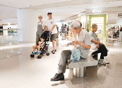 ■酷熱天氣下大開冷氣的商場,吸引不少市民到場「避暑」,更趁機消費,炎炎夏日旺丁又旺財。 本報記者劉國權攝