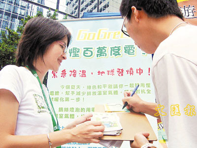■綠色和平發起「Go Green!齊慳百萬度電」行動,希望市民透過轉用慳電膽,為環保出一分力。本報實習記者鄭啟源 攝