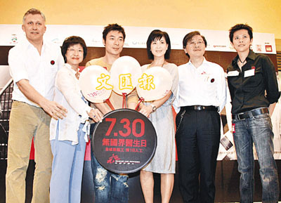 今天是「7.30 無國界醫生日」,大會今年以「全城做義工,捐一日人工」為口號,鼓勵市民捐出一天收入,至今共籌得逾400萬港元。昨日舉行的「為全城義工打氣」活動,來自政府、醫療界及演藝界名人一同吶喊助威,當中包括食物及衛生局常任秘書長李淑儀(左二)等。 本報記者聶曉輝 攝