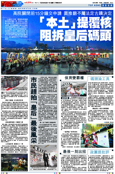 【本報訊】(記者 葉詠儀)皇后碼頭遷拆限期前最後一刻,兩名本土行動成員朱凱迪及何來,終向高等法院申請司法覆核,要求推翻碼頭不屬法定古蹟的決定及禁制政府進行拆卸。法院將在今日早上開庭,決定是否受理有關申請。發展局發言人表示,有關司法覆核,並不影響將皇后碼頭所在位置的用地,移交予中環填海計劃第3期工程承建商作工地;預計當局最快可於今晚午夜開始清場。