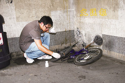 探員檢查死者撞毀的摺合式單車。