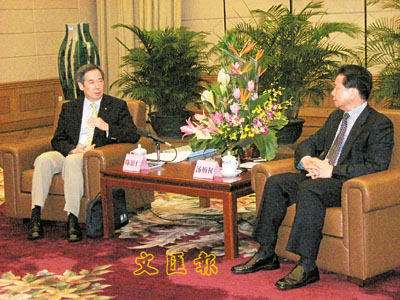 ■香港工業總會主席陳鎮仁向廣東省常務副省長湯炳權反映國家加工貿易政策調整對在粵港企的影響。 本報廣州傳真