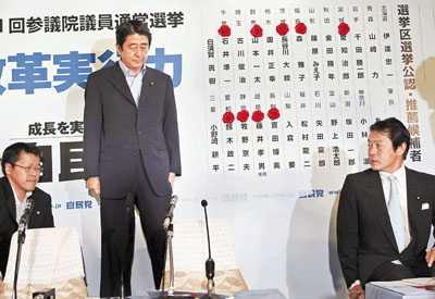 由自民黨和公明黨組成的執政聯盟,在前日的日本參議院改選中慘敗,令自民黨在50多年來首次失去參議院控制權。面對空前下台壓力的首相安倍晉三仍堅拒辭職,他揚言希望透過改組內閣救亡,日本國內兩大報章都敦促安倍下台,加上來勢洶洶的民主黨爭取解散眾議院,令安倍政府的形勢更加惡劣。