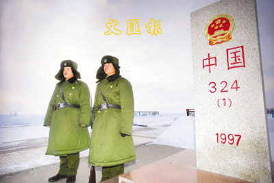■2006年1月28日20時,在中哈邊境,伊犁軍分區某部邊防連戰士劉鵬濤(左)和鄧小敏在中國界碑前站崗。 新華社