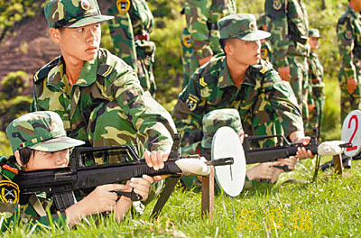 ■香港青少年軍事夏令營女學員在軍官的指導下,進行實彈射擊。