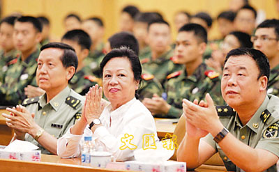 ■軍事夏令營發起人董趙洪娉(中)及駐軍司令員王繼堂(右)探訪學員,並鼓勵他們要努力學習,報效國家。