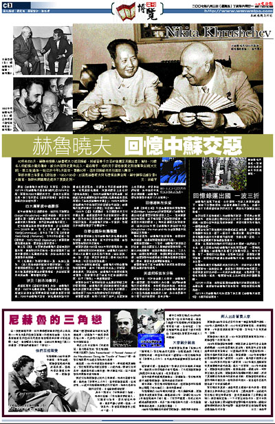 40年前的8月,蘇聯前領導人赫魯曉夫口述回憶錄,將錄音帶千方百計偷運至美國出書;當時,70歲老人的記憶力難免偏差,部分內容與史實有出入。最近幾年,他的兒子替他核實史料後重新出版(英文版),第三卷(最後一卷)已於今年5月面世。事隔40年,這本回憶錄依然引起世人矚目。
