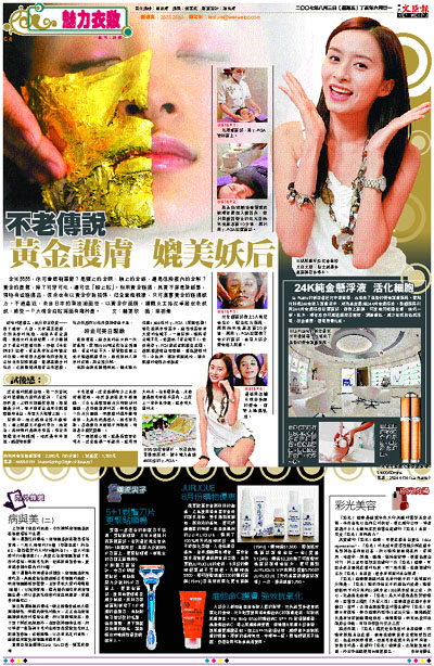 近年的護膚品,成分愈出愈貴──除了琥珀、人參,又有靈芝護膚。今期美容的新寵,相信非黃金莫屬。東西方的美容發展,不少都提及了黃金的護膚功效,好像《本草綱目》記載,黃金具有抗炎和鎮定的功能,而慈禧太后每晚亦會用足金如意來按摩肌膚。據稱在遠古的埃及,已經懂得利用黃金來護膚,埃及妖后亦以此來保持青春不老。