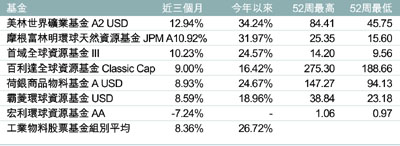 佔近三個月榜首的美林世界礦業基金,基金將不少於70%總資產淨值投資主要經營生產基本金屬及(例如鐵礦及煤)工業礦物的礦務及金屬公司股票。