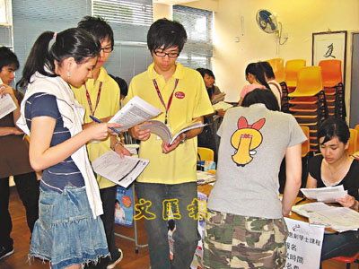■會考放榜後,不少失意考生也會選擇報讀副學士先修課程,以求繼續升學。圖為今年高考放榜當日,院校在中學招生的情況。資料圖片