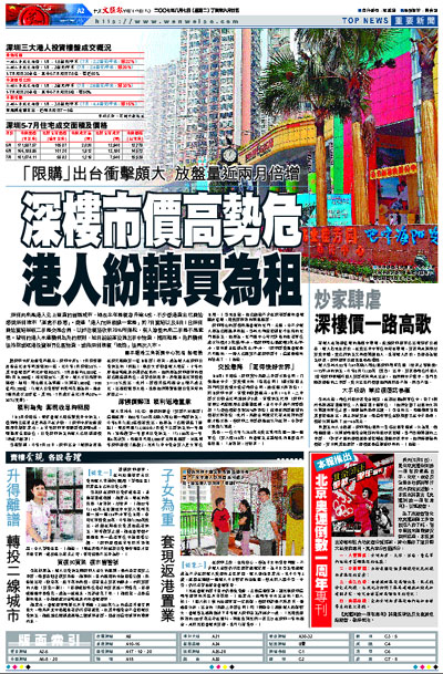 「自5月份開始,很多香港人開始變賣手中物業,獲利兩三倍甚至更高者不在少數。」深圳中原地產總經理李耀智表示,上半年深圳市整體房價暴漲4成,漲幅居全國首位,投資深圳物業的港人已感到樓價「高處不勝寒」。