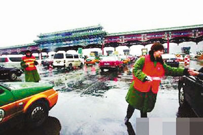 ■北京機場高速公路出現擁堵的狀況,在收費站前等待的車輛排成了長龍。 網上圖片