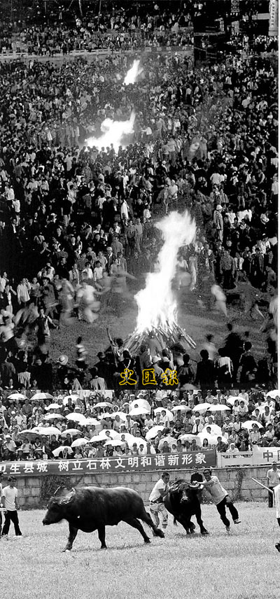8月6日,「2007中國石林國際火把節」在雲南石林彝族自治縣舉行,當地的彝族撒尼人舉行了傳統的鬥牛比賽和盛大的火把狂歡節。下午,15萬海內外的遊客興致勃勃地觀賞了196頭牛的精彩比賽;夜晚,大三弦彈起來,火把燃起來,歡樂的阿細跳月把節日推向了高潮。 ■本報駐雲南記者李青蔓、蓮子