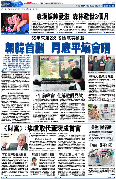 繼朝鮮上月關閉寧邊核設施後,朝鮮半島和平再露曙光,韓國總統府與朝鮮中央通訊社昨日同時宣布,韓國總統盧武鉉與朝鮮領導人金正日將於本月28日至30日在平壤舉行韓朝首腦會晤,是自2000年以來首次。中國、美國及日本均希望會晤能取得積極成果,並有助於地區的和平與穩定。不過,韓國反對派卻指峰會是盧武鉉的選舉伎倆。