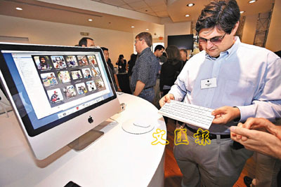 ■電腦用戶魯賓在加州的發報會上試用新iMac,他似乎對細小鍵盤特別有興趣。 彭博社