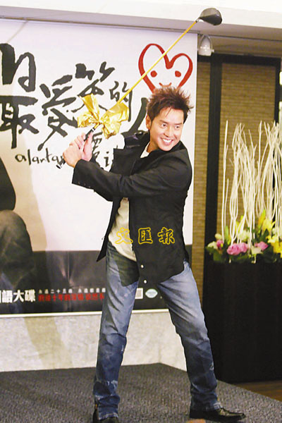 ■譚詠麟收到金色高爾夫球桿之後,先作「一揮」,尚未「沖天」。 中央社