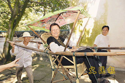 ■范太興致盎然地乘轎遊覽常德市的桃花源。