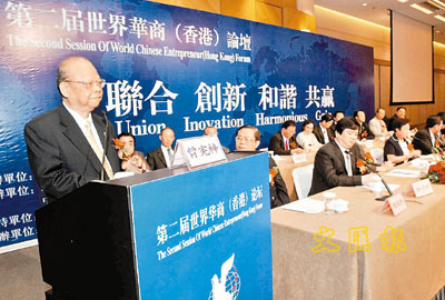 ■曾憲梓在第二屆世界華商論壇上發言。本報記者李志樑 攝