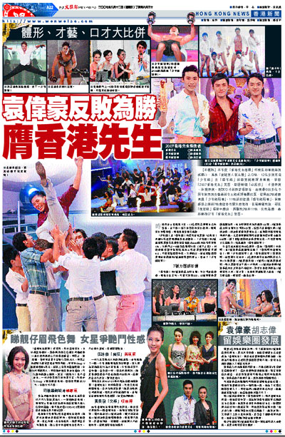 【本報訊】本年度「香港先生選舉」昨晚在將軍澳電視城舉行,秉承「創造男人新主義」之口號,12位分別來自「少年組」及「盛年組」的型男施展渾身解數,爭取「2007香港先生」美譽,經過幾個「必殺技」:才藝表演 、泳裝表演、測試口才的問答環節等,由現場600多位不同年齡界別及職業的女士組成評審團投票,結果由2號趙國東獲「少年組冠軍」、11號胡志偉獲「盛年組冠軍」、有風頭躉之稱的7號袁偉豪可謂失而復得,在首輪落敗後,卻在「復活戰」環節中勝出,再擊敗2號和11號,反敗為勝,最終贏得07年「香港先生」榮譽。