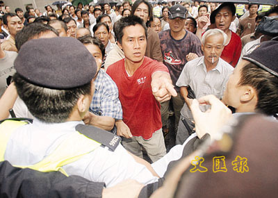■堵塞中區的紮鐵工人昨與警方對峙,場面火爆。本報記者彭子文 攝