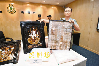 ¡@¬Qâ±á4®É30¤À¡A®üÃö¤HûÀˬd¤@§å±q¦L«×³t»¼¨ì´äªº¥]»q¡Aµo²{¤@±i³øºÙÂà¹B¥xÆWªºªoµeªO³f³æ¦³¥iºÃ¡A¶i¤@¨BÀˬd®É¡A¦bªOµe¤Î¤ì²½¾Â¤ºÀËÀò¥«È¹O160¸U¤¸ªº´âÓiବr«~¡C