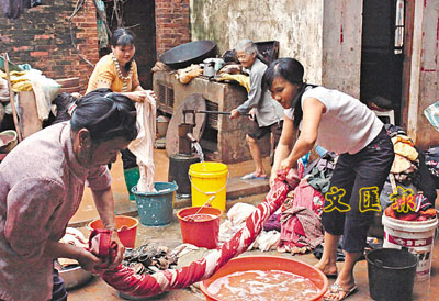 ■13日,受災較嚴重的雷州北和鎮感鵝村民返回家園後,清理被洪水浸泡過的財物。 新華社