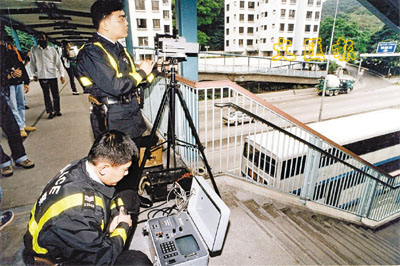 ■4名的士司機,涉在交通違例事件安排3人「頂包」,7人同被廉署檢控。圖為警方在行人天橋上以鐳射槍捉違例車輛。資料相片