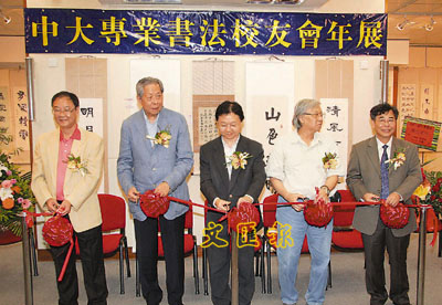 ■全國政協委員施子清(左二)及校外進修學院書法指導老師錢開文(左一),院長李仕權(中)、藝術與文化課程統籌蘇建榮(右二)、校友會會長梁國柱主持剪綵。 本報記者曾慶威 攝